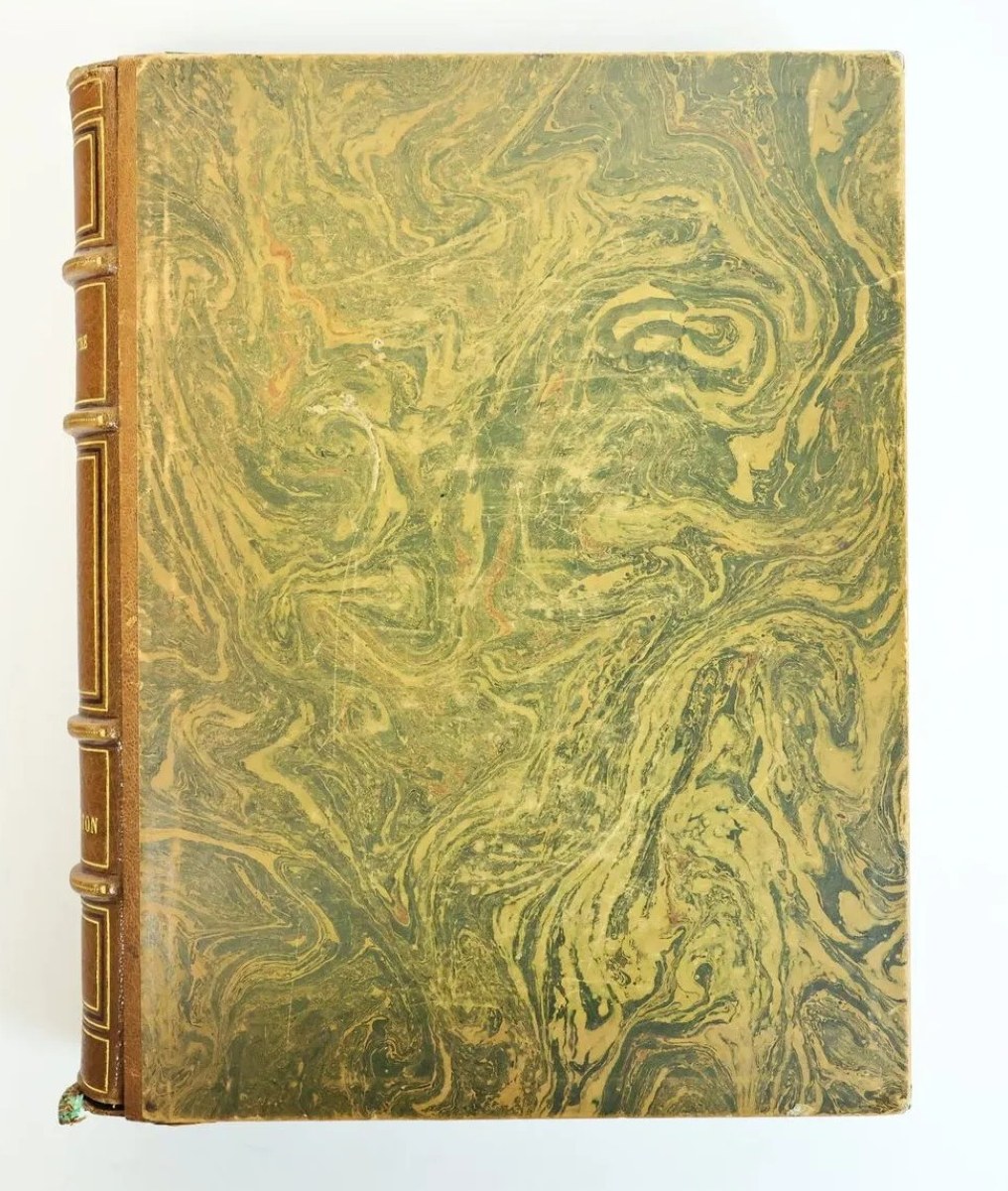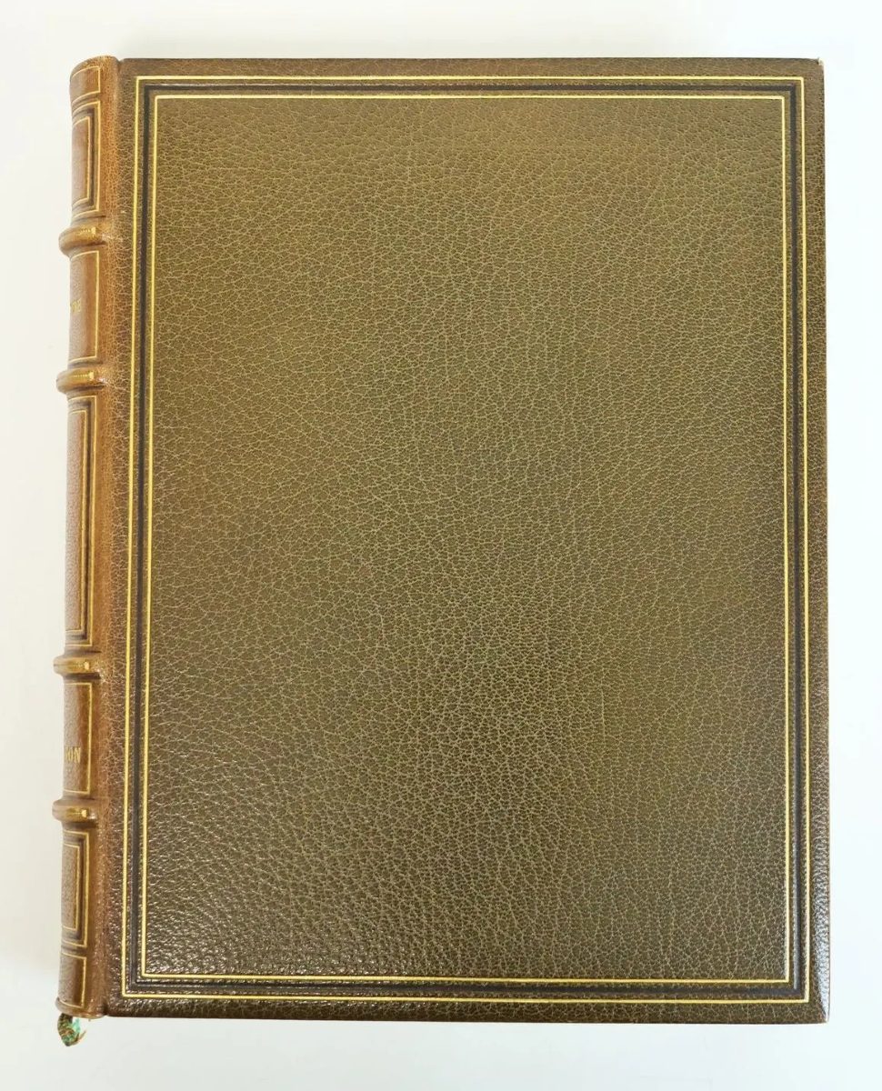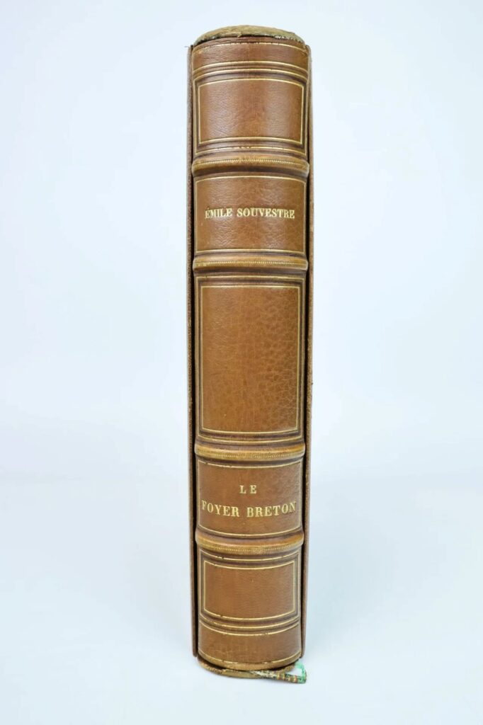 Descriptif : SOUVESTRE (Émile). Le Foyer Breton. Contes et récits populaires. Paris, Société des Amis du Livre Moderne. 1910, in-4, eaux-fortes hors texte et in texte d’André Dauchez, maroquin brun d’époque, reliure signée Charles Meunier 1911, dos à nerfs et caissons dorés, triple encadrement doré et noir sur les plats, tranches dorées, numéroté 140/150 (faisant partie des exemplaires mis dans le commerce), emboîtage, insolation du dos, une serpente déchirée en bas, très légers frottements, usures à l’emboitage