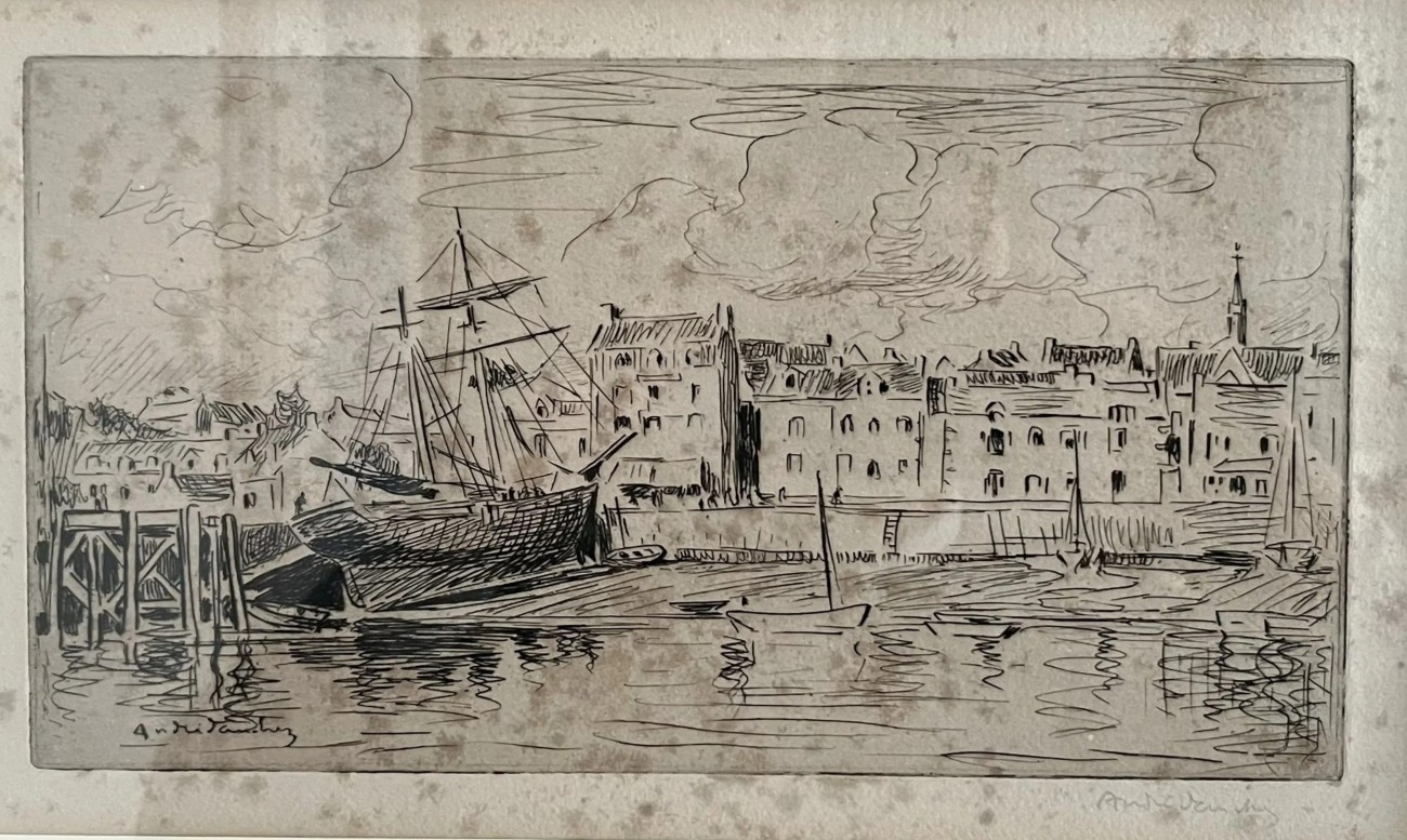 Descriptif : André DAUCHEZ (1870-1948) « Port » Eau-forte signée. (Piqûres) 18 x 31,5 cm (à vue)