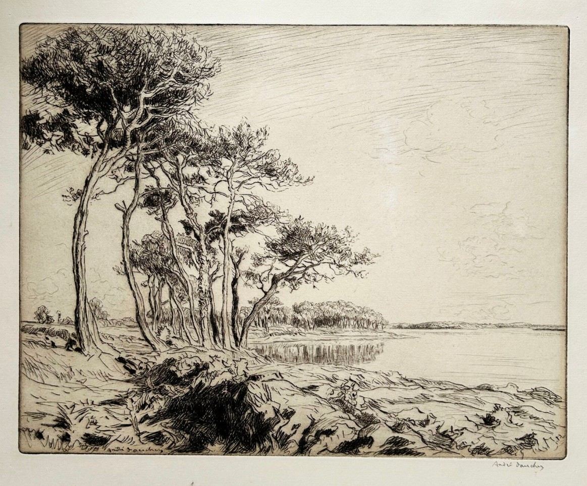 Descriptif : André DAUCHEZ (1870 – 1948) – « L’Île Chevalier », (Bretagne, Finistère). 1927. Eau-forte originale. Signée à la pointe dans la planche, en bas à gauche. Belle épreuve sur papier vélin, contresignée au crayon par l’artiste. Bonnes marges. Le Musée Breton de Quimper conserve une épreuve similaire. 39,3 x 47,5 cm. Etat A/B (deux légères traces d’oxydation dans le ciel sinon bon état général).