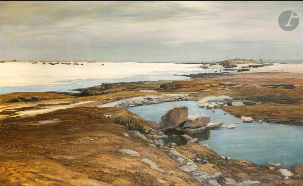 Descriptif : André DAUCHEZ (1870-1948) Estuaire, 1913 Huile sur toile. Signée en bas à droite. (Petits manques). 74 x 116 cm Expositions : – Salon de la Société Nationale des Beaux-Arts, Champs-de-Mars, Palais des Beaux-Arts, Paris, 1913, n° 323 (fragment d’étiquette sur le châssis). – Exposition d’Art français, Palais des Beaux-Arts, Barcelone, 23 avril-1er juillet 1917, probablement n° 20.295 (étiquette sur le châssis). Bibliographie : André Dauchez, Liber Veritatis, Catalogue de peintures, Musée départemental breton, Quimper, n° 298, reproduit. Nous remercions Monsieur Jacques Guépin, arrière-petit-fils de l’artiste, d’avoir aimablement confirmé l’authenticité de cette œuvre et pour les informations qu’il nous a transmises.