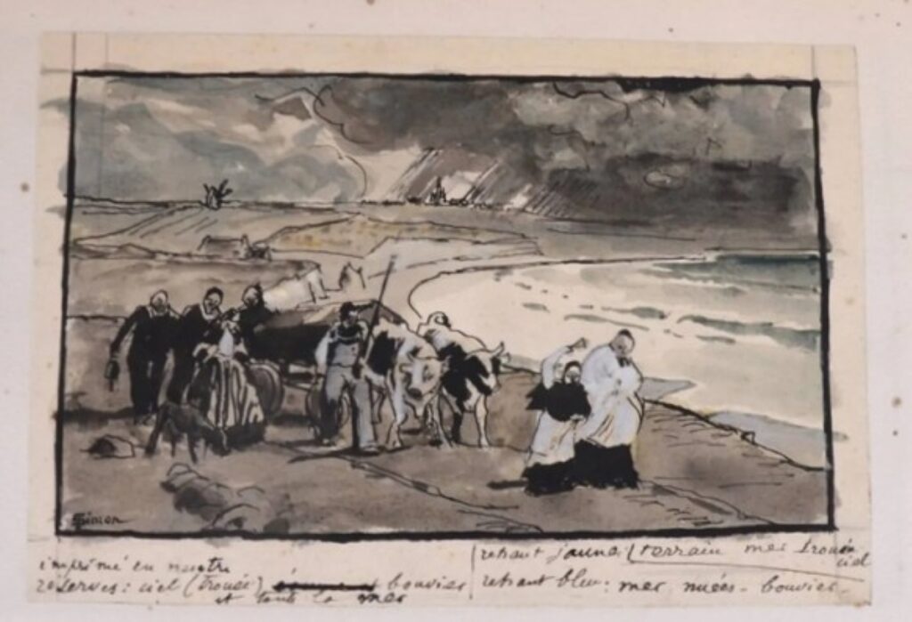 Descriptif : SUARÈS (André). Le Livre de l’Emeraude. En Bretagne. Paris, Imprimé pour la société du livre d’art, 1914. In-4 maroquin vert émeraude, dos à quatre nerfs, titre doré, encadrement intérieur de filets et guirlandes florales dorés avec chardons dorés et mosaïqués en écoinçons, doublures et gardes de reps brun caramel, tr. dorées, couv. et dos conservés (Ch. Meunier). 30 compositions de C. COTTET, A. DAUCHEZ et L. SIMON, gravées à l’eau forte par Cottet et Dauchez. Tirage à 150 exemplaires sur vélin ; n°95 des 100 de tête réservés aux membres de la Société, enrichi ici de 4 DESSINS ORIGINAUX : une aquarelle originale signée de C. Cottet, un beau lavis original signé avec envoi de A. Dauchez, un dessin préparatoire à la gouache et au lavis signé par L. Simon avec indications de tirage, et un lavis original signé avec envoi de L. Simon. Fortes piqûres sinon bel exemplaire. Ancienne collection Louis Meley (1850-1924) industriel et grand collectionneur algérois. Il se constitua dans sa villa d’Aïn Taya, près d’Alger, une importante collection grâce à un goût sûr et une solide culture artistique. Proche notamment de Auguste Rodin, dont il acquiert directement une œuvre majeure, il réunit des pièces d’artistes renommés comme Bourdelle, Renoir ou Gauguin, mais aussi de peintres liés à l’Algérie : Dinet, Racim, Suréda, Mammeri. Amateur généreux, il accueille régulièrement ces artistes chez lui et entretient avec eux une correspondance nourrie, faisant de sa demeure un lieu d’échanges et de création.