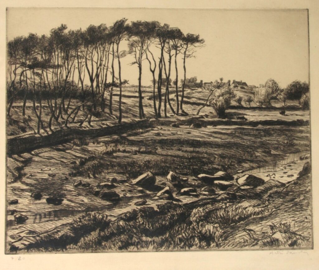 Descriptif : André DAUCHEZ (1870-1948) « Sentier de pins et vaches au pré », gravure à l’eau-forte, signée bas droite, tirage 7/80, 32,5 x 41 cm